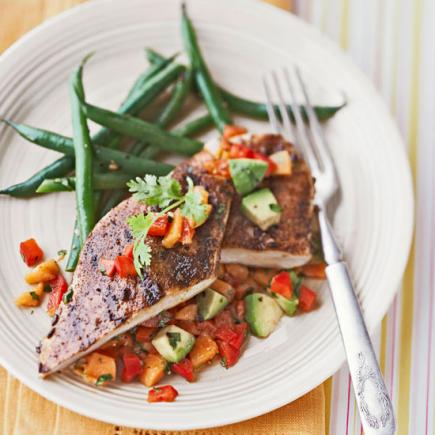 A zesty fresh salsa tops flavorful chicken breast. A little bit of creamy avocado goes a long way to making the dish taste more indulgent than it really is. Full recipe here